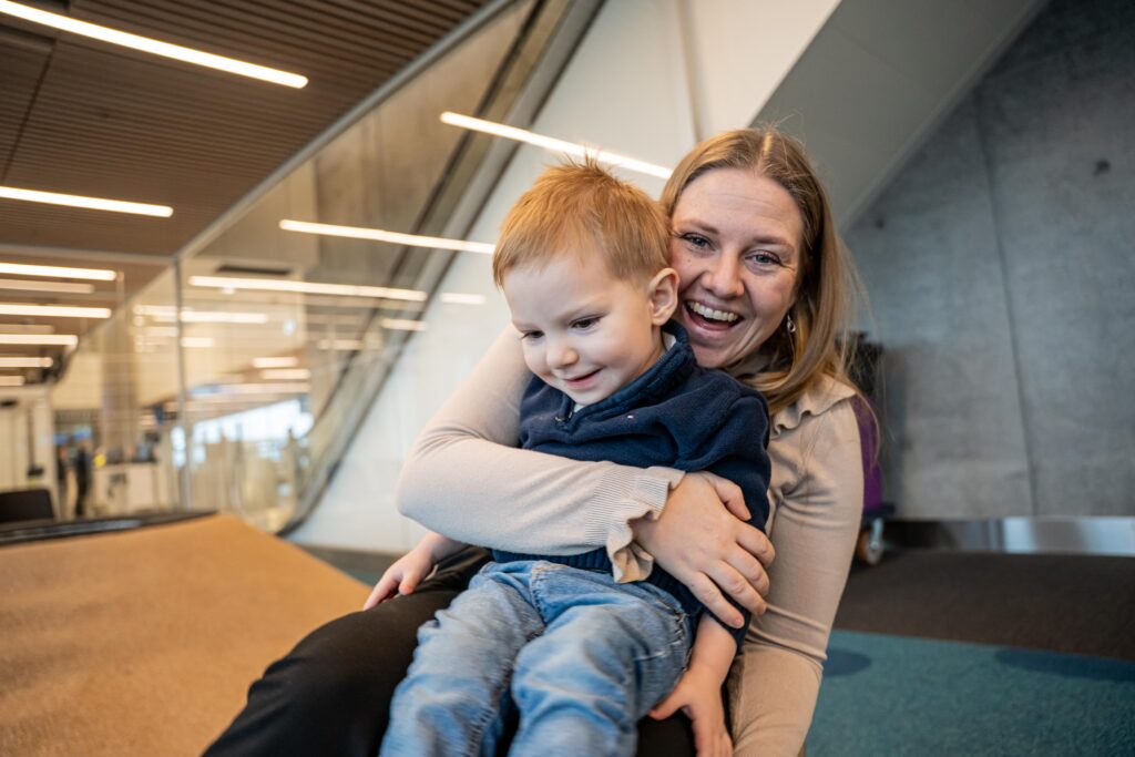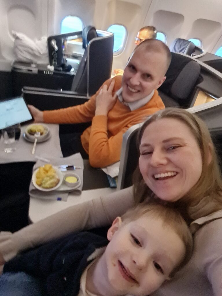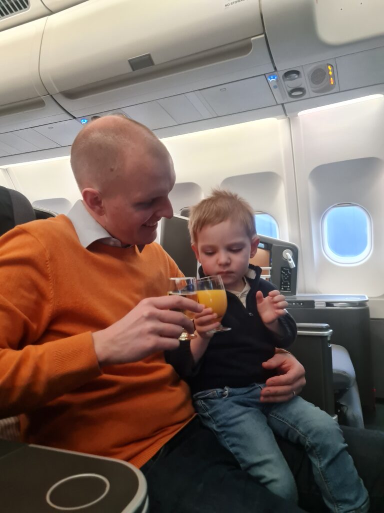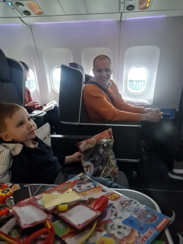 Det var första gången Vidar flög sedan han fyllt två år och där med första gången han hade egen stol. Han satt så fint i den under start och landning, och det var också de enda gångerna stolen användes. Resten av tiden spenderades i våra stolar. Lek varvat med mys och mat.