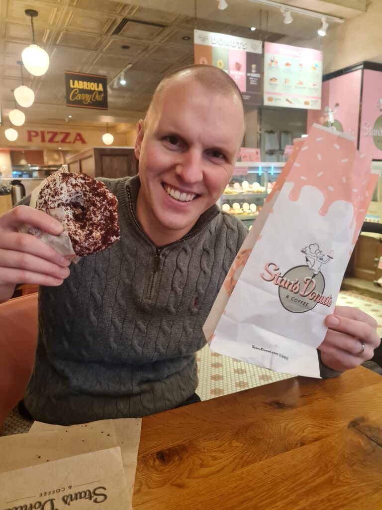 Efter brandstationen blev det en sista tur till favoritlekplatsen. Därefter påbörjades jakten på en bil som Vidar blivit lovad att köpa. Det visade sig bli svårare än väntat då det inte fanns onödigt många leksaksaffärer i området vi var i. Vi hittade dock en munk till Vidar och hittade sedan en sportbar där vi fick en god lunch. Med nya krafter tog vi oss till Macys och Vidars val föll efter mycket letande på ett paket med en brandbil, en ambulans och en polisbil. En riktig bra sista dag innan vi sov nästan hela vägen hem på planet. Aldrig har det gått smidigare att flyga! Gissar att övning gett färdighet och med över 20 flygningar i bagaget börjar Vidar få riktig rutin.