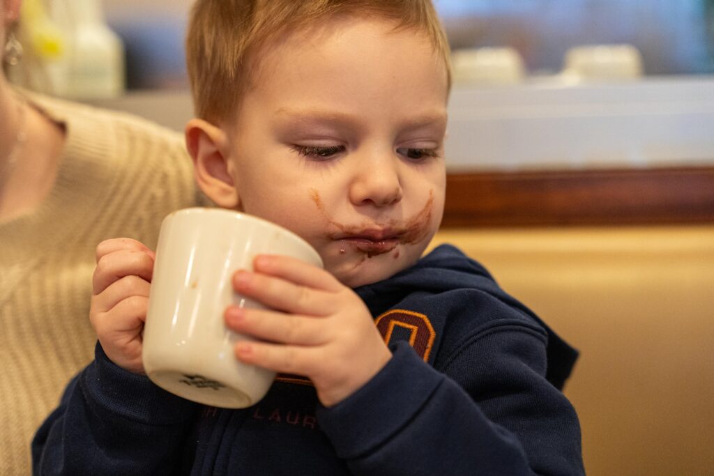 Vi hade kollat upp att det låg en restaurang som skulle servera bra frukost här, Lou Mitchell´s , så det var dit vi styrde stegen. Vidar hade fortfarande en del besvär i munnen med några oklara blåsor som gjorde ont. Han fick därför äta precis vad han ville så länge han åt. Hela morgonen hade han pratat om smoothie så när detta inte fanns på menyn var det bara att sätta honom på axlarna och ge sig iväg på jakt. En lång promenad senare hittade vi Cirkel K och kunde där få tag i en. När vi kom tillbaka till restaurangen drack Vidar två klunkar och fick sedan jätteont i munnen då smoothin var lite skarp. Istället slutade det med att vi fick beställa in kopp efter kopp med varm choklad och ingen var lyckligare än vi för att han drack. Efter en riktig amerikansk frukost bestående av gigantiska pannkakor och en lika stor omelett lämnade vi restaurangen.