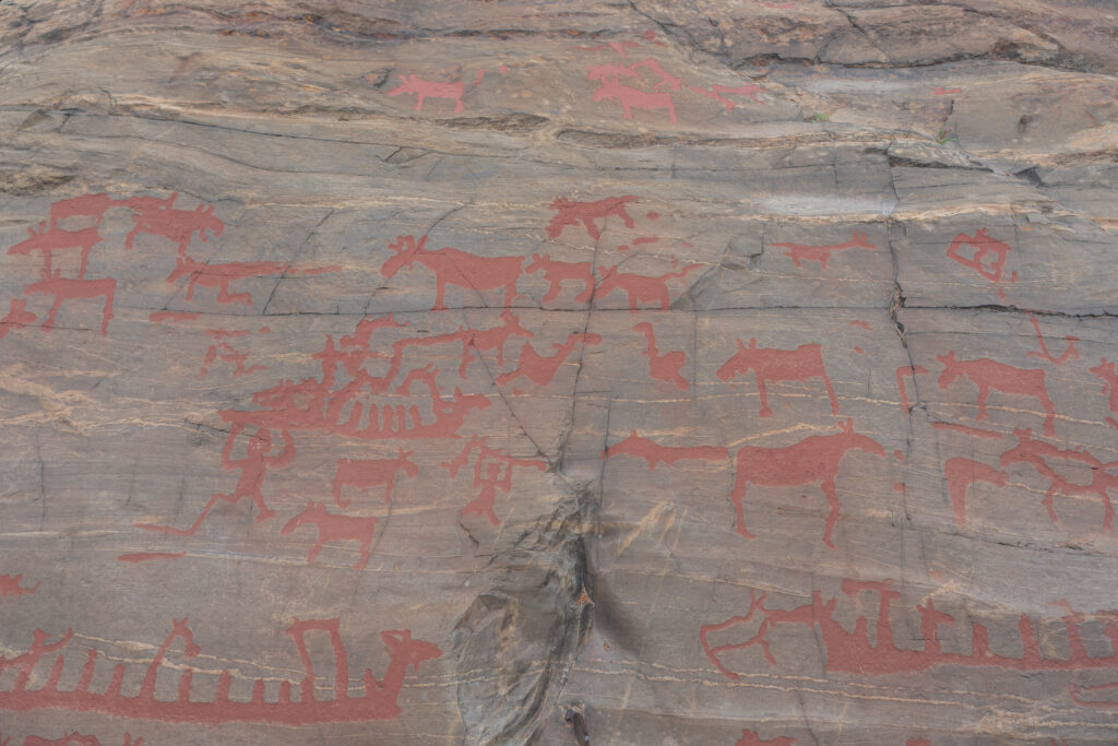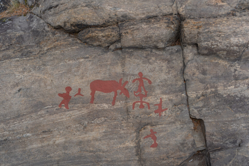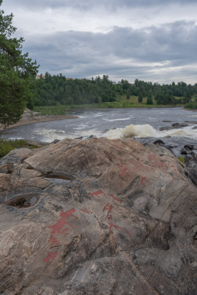 Första stoppet var Nämforsen. Här skulle vi besöka ett hällristningsområde som är ett av norra Europas största. På öarna i forsen finns minst 2500 figurer inhuggna i klipporna. Motiven, som till största del bestod av många älgar och andra djur, visar att ett fångst- och jägarfolk levt här.