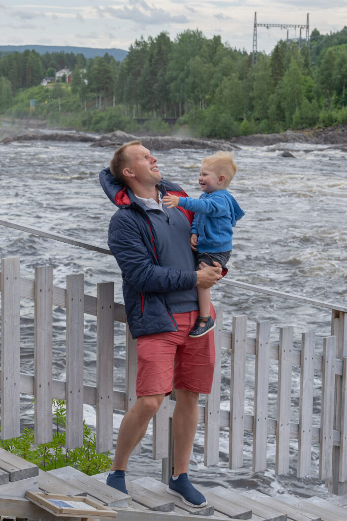 Hällristningarna kom dock lite i skymundan eftersom de låg precis vid Nämforsens kraftverk. Ett riktigt stort vattenkraftverk med en fallhöjd på 22 meter. Detta var Vattenfalls största kraftverk när det byggdes 1946. Under sommarmånaderna passerar 125 m3 vatten per sekund. Mäktig upplevelse att vara nära. Även Vidar tyckte nog att kraftverket var mer intressant än hällristningarna och samlade fickorna fulla med kottar som han sedan roade sig med att kasta ner i forsen.